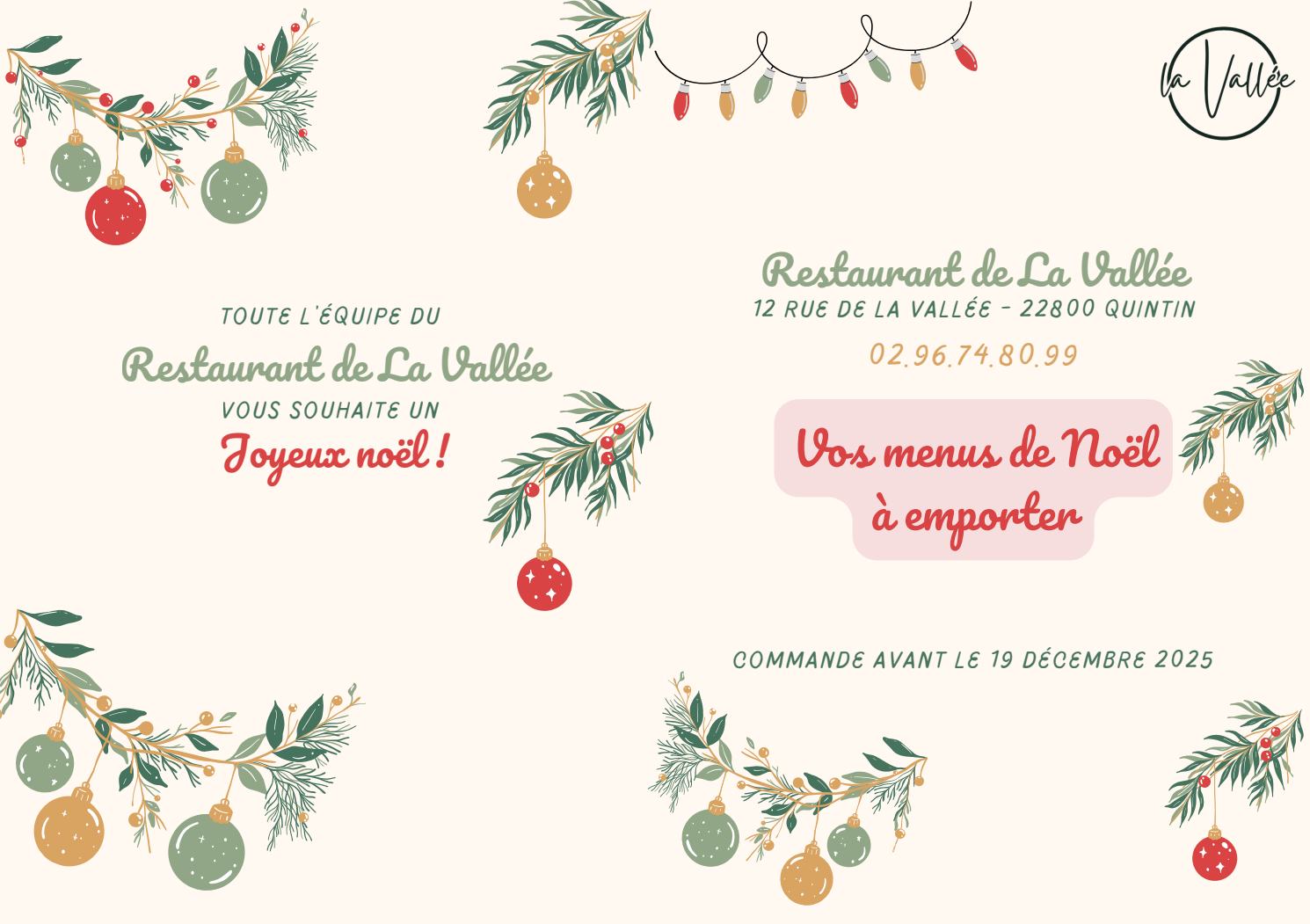 La Vallée est également à votre disposition pour vos réceptions, repas de mariage, et toutes Fêtes Familiales et repas professionnels, au restaurant ou sur vos lieux de réception.